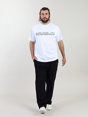 Брюки мужские прямые. Отрезной пояс выполнен из основного полотна. В поясе функциональный кругловязаный шнур вставлен в петли. Карманы наклонные с отрезным бочком. Декорированы жаккардовой этикеткой "продолжать".