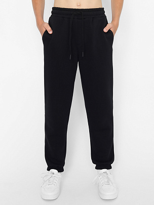 Брюки с притачным поясом и манжетами. В пояс вставлена резинка и функциональный шнур. Пояс и манжеты выполнены из полотна с эластаном. В боковой части брюк располагаются карманы. На передней части в области колена расположен декоративный подрез. На задней части брюк расположена декоративная вставка контрастного цвета. Карман декорирован вязаной нашивкой.
