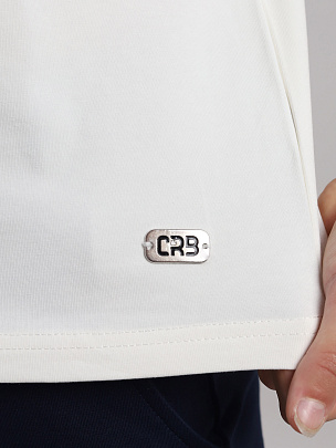 Джемпер для девочки с короткими рукавами, свободного силуэта, спущенным плечом и отложным воротником. Сзади застежка на пуговицу. Спереди декорирован металлическим лейблом.