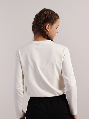 Джемпер свободного силуэта для девочки со спущенным плечом и длинными рукавами. Полочка декорированя кружевом. Воротник из основного полотна.