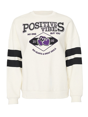 Джемпер для девушек с длинными рукавами оформлен в спортивном стиле. Свободный силуэт с заниженной линией плеча не сковывает движения. Нижние срезы переда и спинки оформлены притачным эластичным поясом. Рукава с эластичными манжетами по низу. Рукава и перед джемпера декорированы принтом "положительные эмоции".