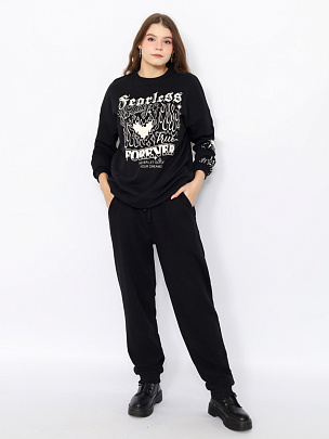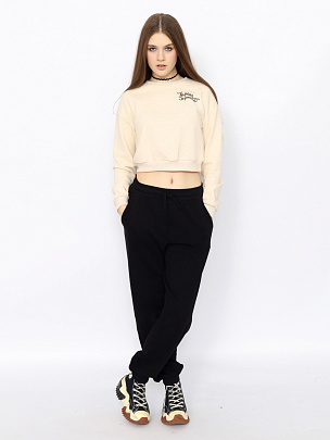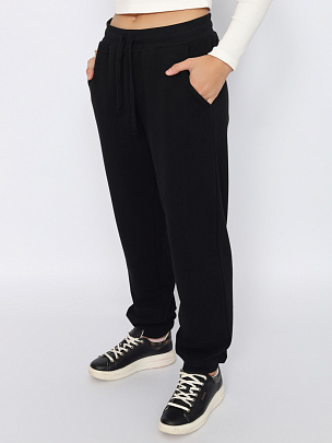 Свободные трикотажные брюки с карманами. В притачной пояс вставлена резинка и функциональный шнур. Нижние срезы брюк оформлены манжетами.