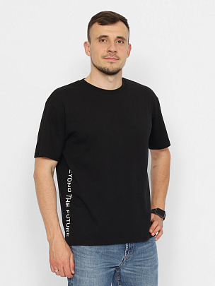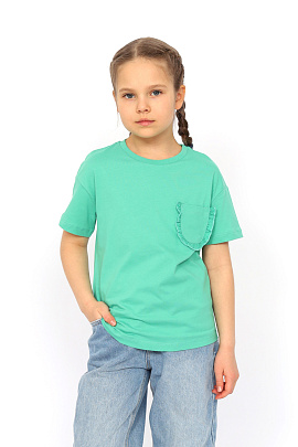 Футболка прямого силуэта с короткими рукавами. Горловина круглая, обработана притачной бейкой из рибаны с лайкрой. Перед футболки декорирован принтом с использованием глиттера.